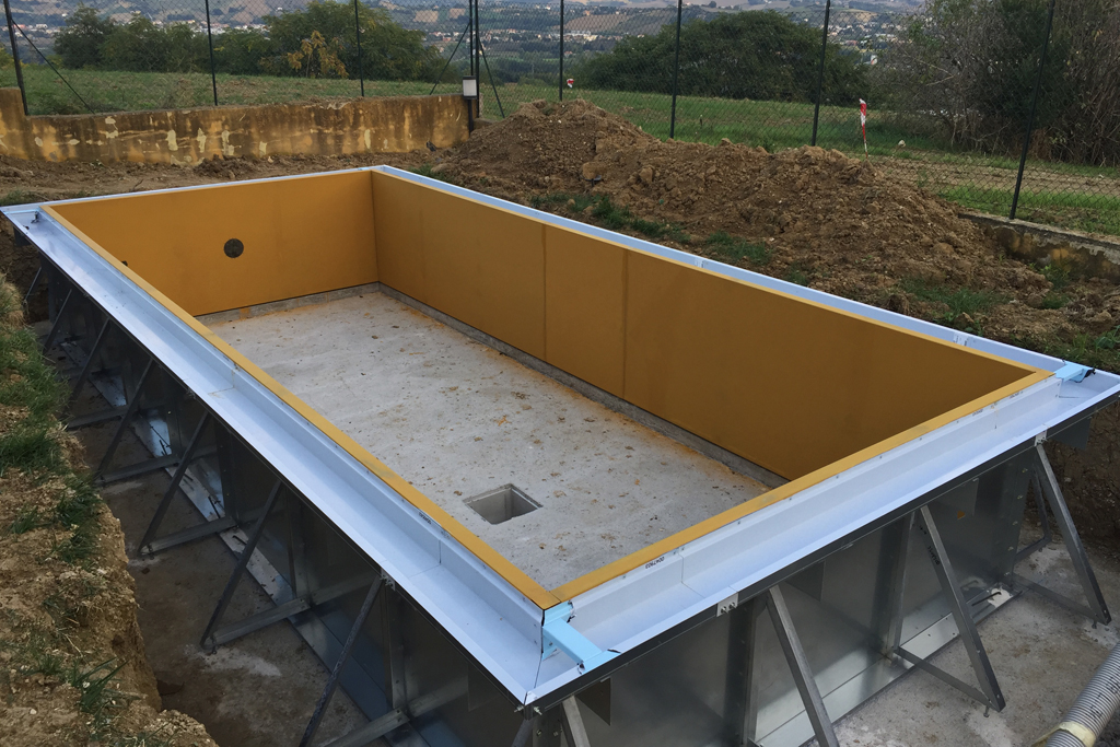 Piscina a sfioro totale realizzata a Magliano di Tenna, impreziosita da griglie in travertino che coprono il canale di sfioro.